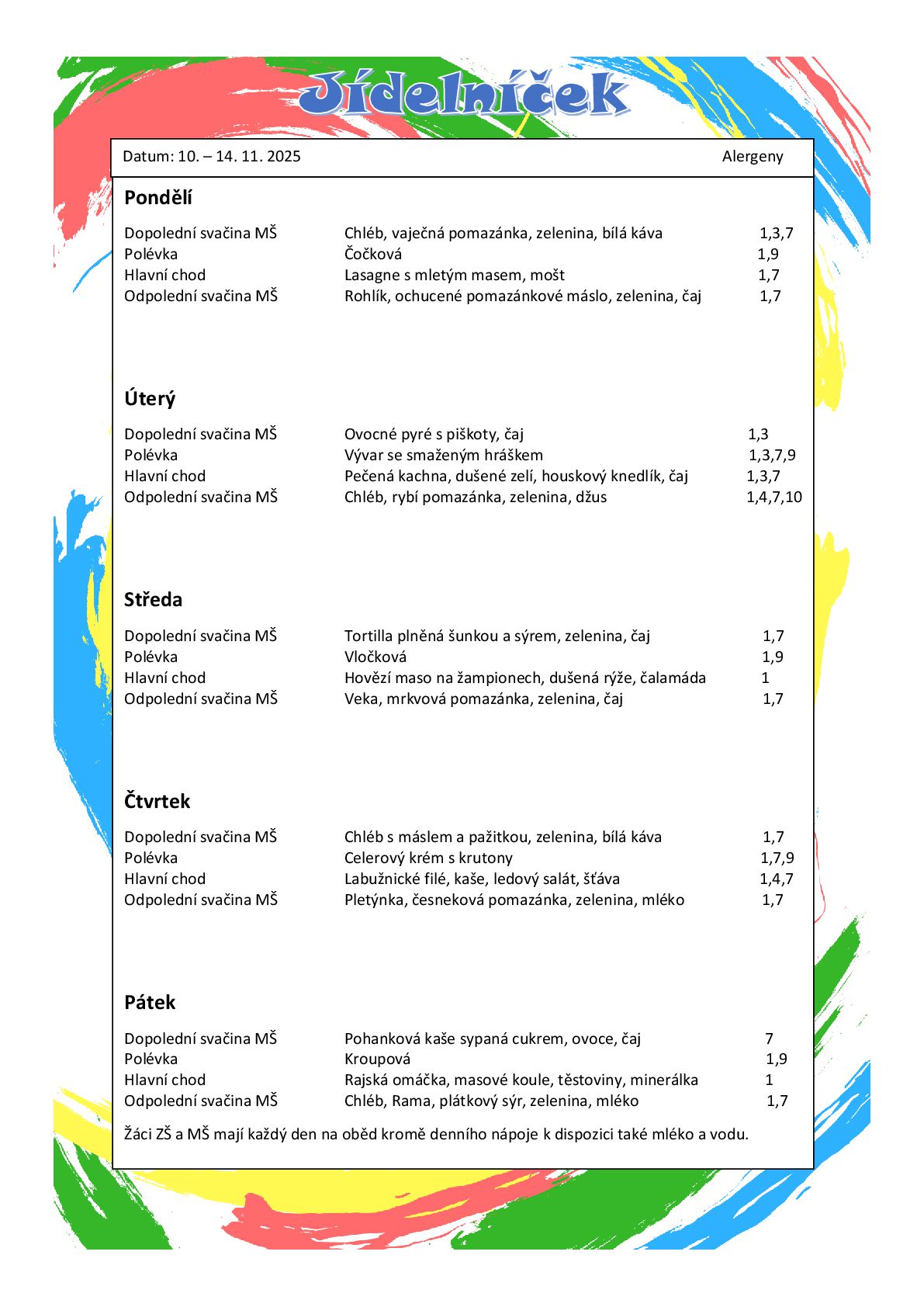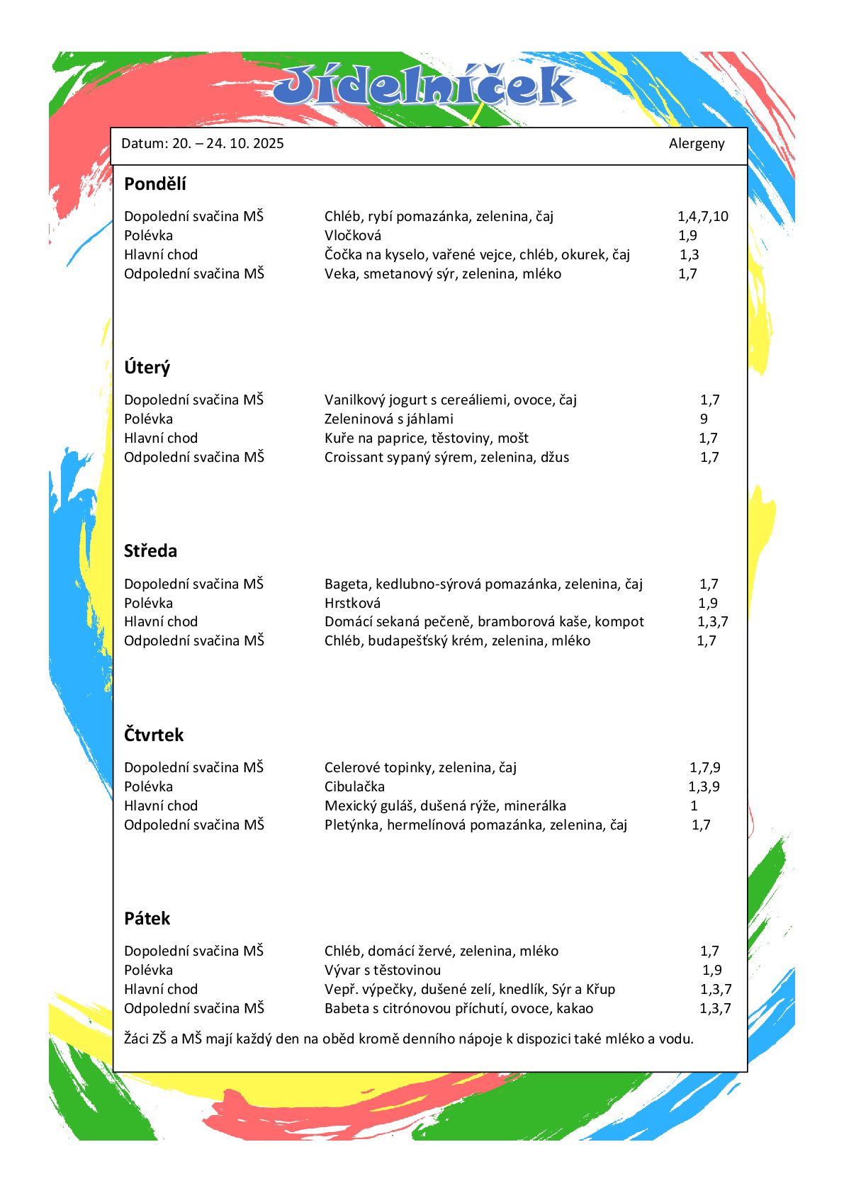 Zde naleznete jídelníček pro základní i mateřskou školu na daný týden.