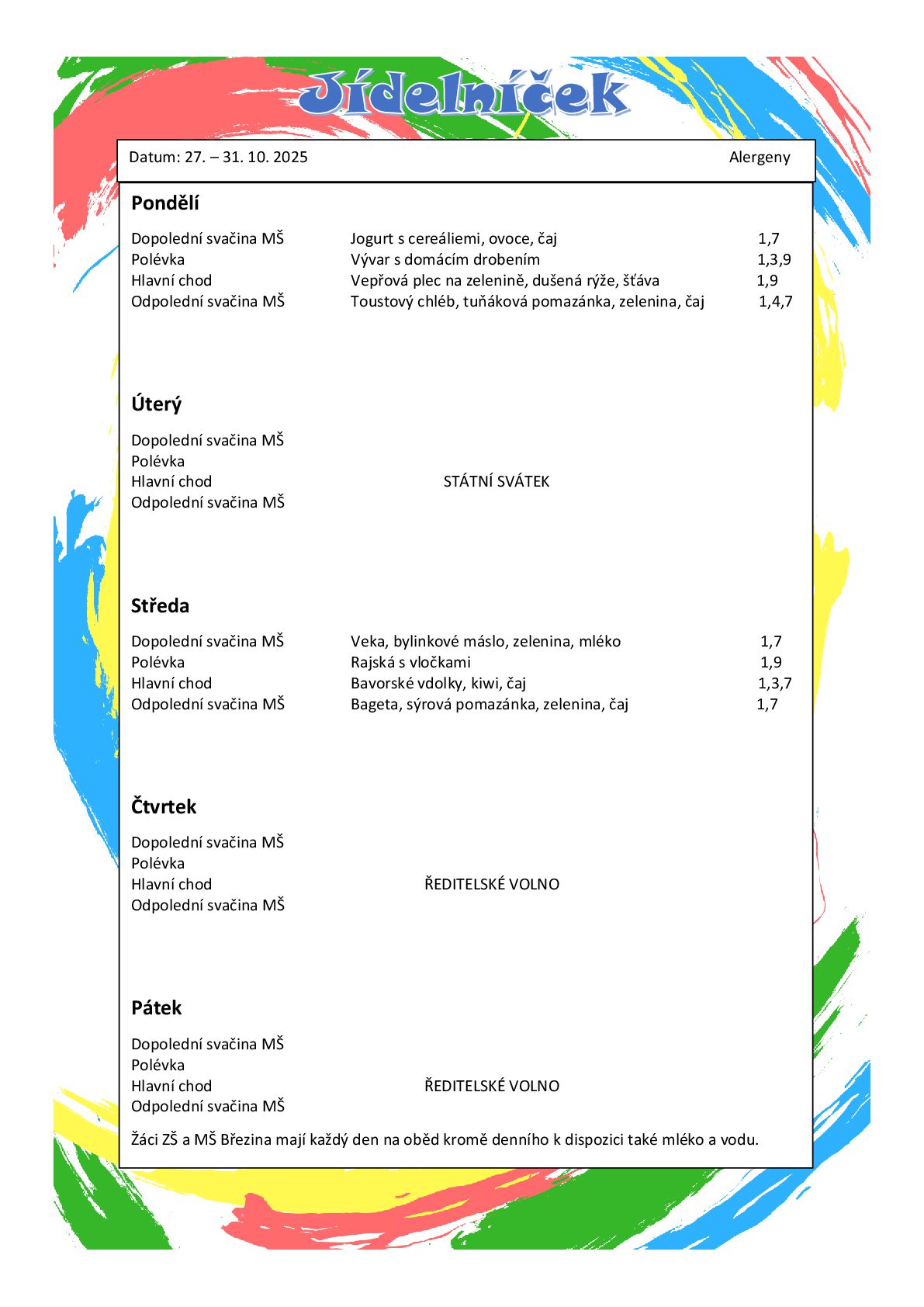 Zde naleznete jídelníček pro základní i mateřskou školu na daný týden.