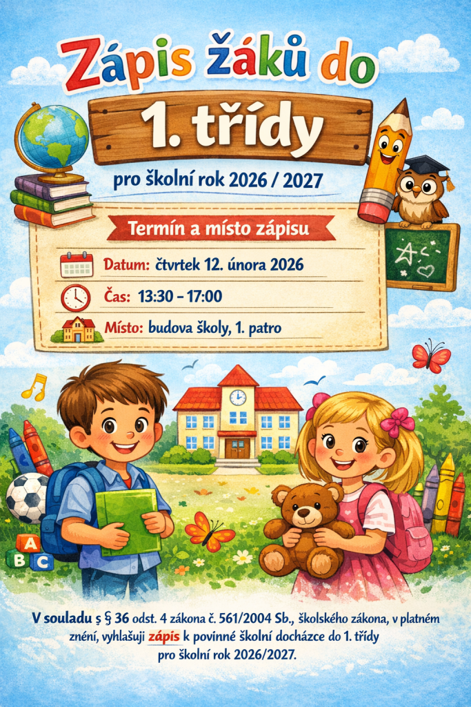 V souladu s § 36 odst. 4 zákona č. 561/2004 Sb., školského zákona, v platném znění, vyhlašuji zápis k povinné školní docházce do 1. třídy pro školní rok 2026/2027.